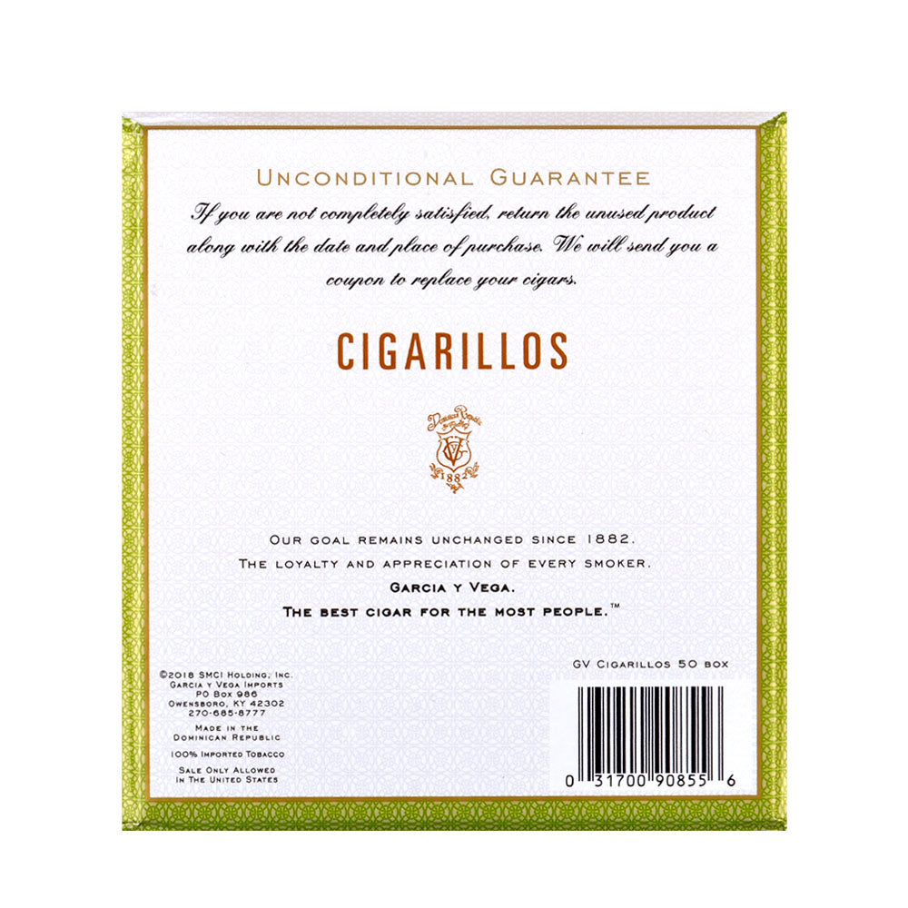 Since 1882, Garcia Y Vega Cigarillos Claro cigars have promised consistently smooth, mild taste in every cigar they make. Garcia Y Vega Cigarillos use carefully aged filler tobaccos and choice natural leaf wrappers to assure a cigar that's always flavorful and aromatic. Available in a wide choice of sizes and natural leaf wrappers, these very popular cigars offer you a satisfying 'everyday' smoke at convenience store prices. Rich tobacco pleasure and freshness are guaranteed in every cigar Garcia Y Vega makes