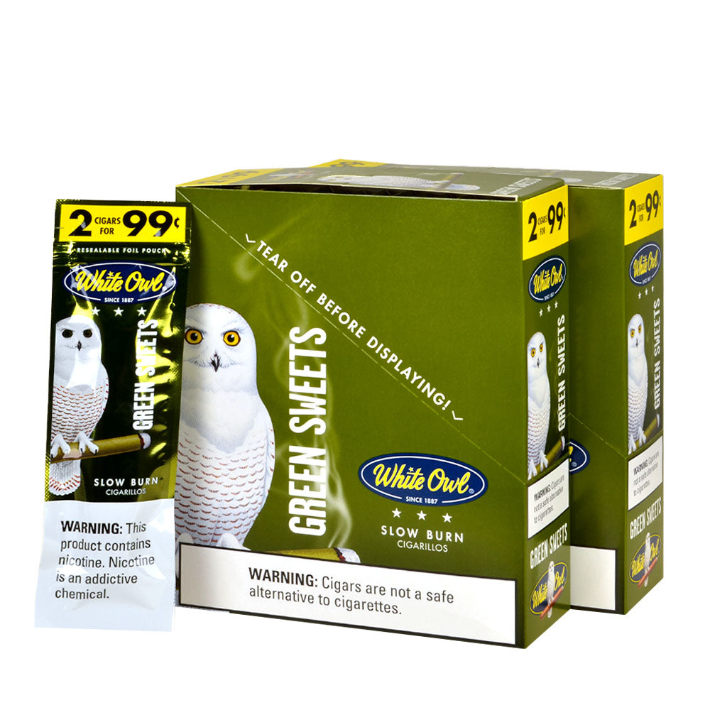 White Owl Green Sweets Cigarillos are an exciting addition to the brand's growing line of premium smokes. Made from tobacco fillers from five nations, these cigars are wrapped in a thin, homogenized wrapper. Each tobacco-filled cigar has a mild to medium-strength flavor that is sure to please. Each one is approximately four and a half inches long and has a ring gauge of 28.